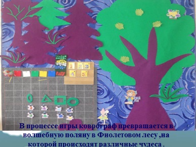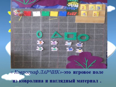 Коврограф «Ларчик» В оскобовича. это игровое поле из ковролина и наглядный материал: «Забавные буквы», «Забавные цифры», «Разноцветные веревочки», «Разноцветные круги» , «Разноцветные квадраты-эталоны цвета», «Буквы и цифры» и оригинальные элементы : зажимы, кармашки. В процессе игры коврограф превращается в волшебную поляну в Фиолетовом лесу, на которой происходят различные чудеса.